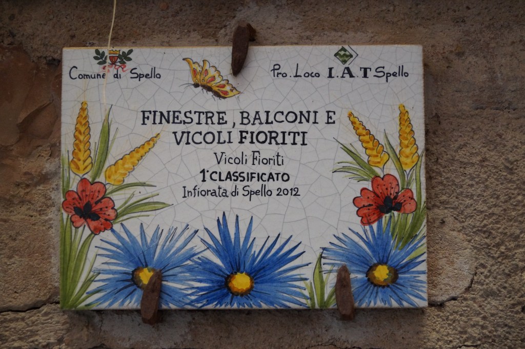 Kto był Spello albo czytał o tym miasteczku zwanym po włosku borgo, wie że to miasto kwiatów. Mieszkańcy prześcigają się w ukwiecaniu okien, balkonów i wejść do swoich domów. Na dowód zdobytych zwycięstw widnieją takie oto tabliczki.